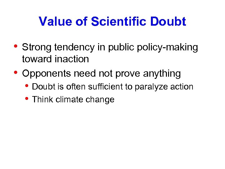 Value of Scientific Doubt • • Strong tendency in public policy-making toward inaction Opponents need not prove anything • Doubt is often sufficient to paralyze action • Think climate change