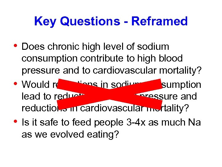 Key Questions - Reframed • • • Does chronic high level of sodium consumption contribute to high blood pressure and to cardiovascular mortality? Would reductions in sodium consumption lead to reductions in blood pressure and reductions in cardiovascular mortality? Is it safe to feed people 3 -4 x as much Na as we evolved eating?