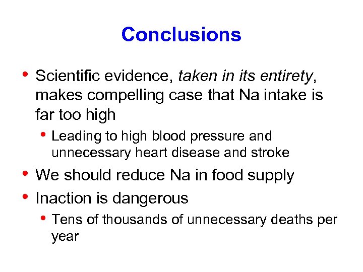 Conclusions • Scientific evidence, taken in its entirety, makes compelling case that Na intake is far too high • Leading to high blood pressure and unnecessary heart disease and stroke • • We should reduce Na in food supply Inaction is dangerous • Tens of thousands of unnecessary deaths per year