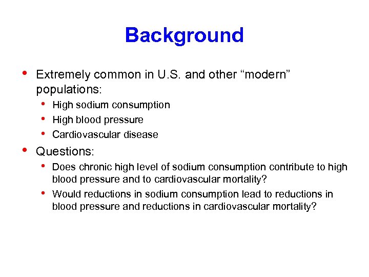 Background • Extremely common in U. S. and other “modern” populations: • • High sodium consumption High blood pressure Cardiovascular disease Questions: • • Does chronic high level of sodium consumption contribute to high blood pressure and to cardiovascular mortality? Would reductions in sodium consumption lead to reductions in blood pressure and reductions in cardiovascular mortality?