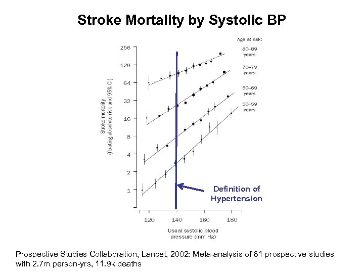 Stroke Mortality by Systolic BP Definition of Hypertension Prospective Studies Collaboration, Lancet, 2002: Meta-analysis of 61 prospective studies with 2. 7 m person-yrs, 11. 9 k deaths