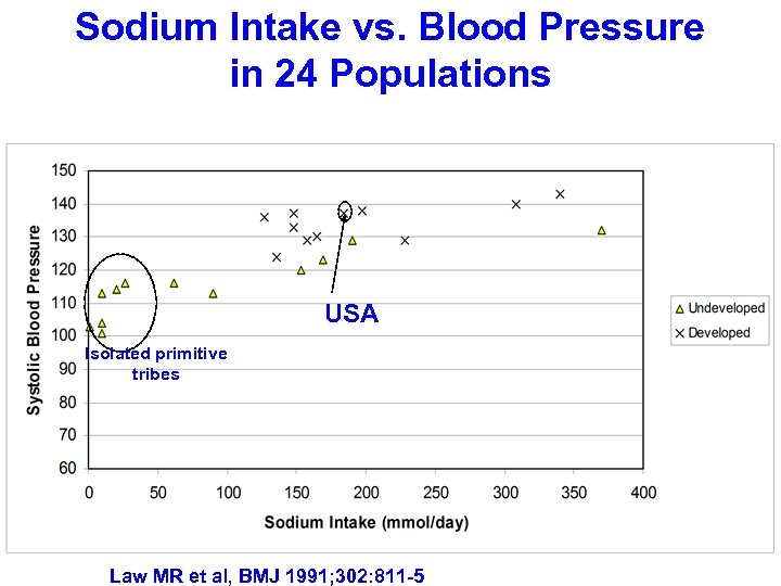 Sodium Intake vs. Blood Pressure in 24 Populations USA Isolated primitive tribes Law MR et al, BMJ 1991; 302: 811 -5