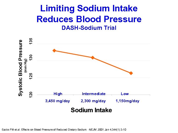 Limiting Sodium Intake Reduces Blood Pressure 135 130 125 120 (mm Hg) Systolic Blood Pressure DASH-Sodium Trial High Intermediate 3, 450 mg/day 2, 300 mg/day Low 1, 150 mg/day Sacks FM et al. Effects on Blood Pressure of Reduced Dietary Sodium. NEJM. 2001 Jan 4; 344(1): 3 -10