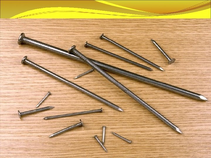 Оглавление: 1. Назначение гвоздей 2. Устройство гвоздя 3. Параметры гвоздя 4. История гвоздя 5. Виды гвоздей 6. Гвоздь в полный рост 7. Разновидности гвоздей 8. Пословицы и поговорки 9. Литература