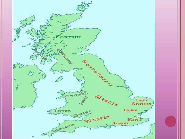 ИСТОРИКО-ГЕОГРАФИЧЕСКИЕ ЭТАПЫ РАЗВИТИЯ История Англии началась с вторжением германских племен англов, саксов, ютов, фризов и созданием ими на территории Британии нескольких раннефеодальных государств. (Кент, Нортумбрия, Мерсия, Восточная Англия, Эссекс, Суссекс, Уэссекс)