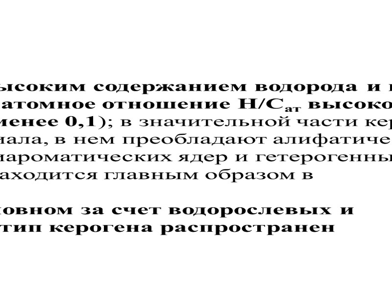 Первый тип — кероген с высоким содержанием водорода и низким кислорода (начальное атомное отношение Н/Сат высокое более 1,5 и 0/Сет низкое — менее 0,1); в значительной части кероген состоит из липидного материала, в нем преобладают алифатические структуры. Содержание полиароматических ядер и гетерогенных связей невелико. Кислород находится главным образом в сложноэфирных связях. Кероген формируется в основном за счет водорослевых и микробных липидов; Этот тип керогена распространен относительно редко.