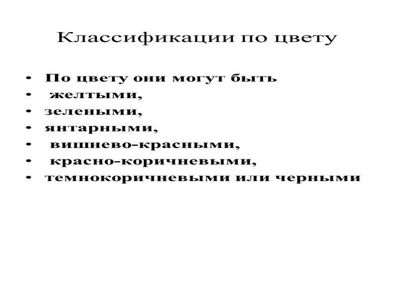 Классификации по цвету По цвету они могут быть желтыми, зелеными, янтарными, вишнево-красными, красно-коричневыми, темнокоричневыми или черными