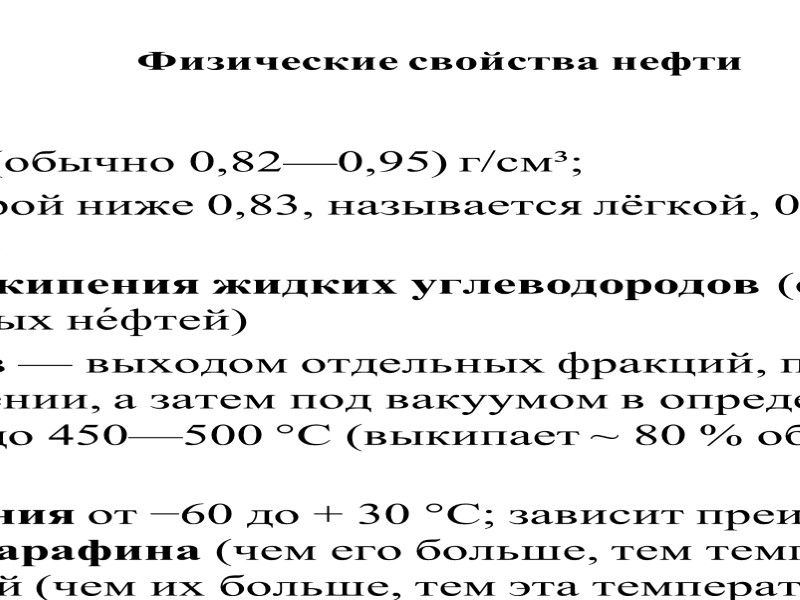 Физические свойства нефти Плотность 0,65—1,05 (обычно 0,82—0,95) г/см³; нефть, плотность которой ниже 0,83, называется лёгкой, 0,831—0,860 — средней, выше 0,860 — тяжёлой. - температура начала кипения жидких углеводородов (обычно >28 °C, реже ≥100 °C в случае тяжелых не́фтей) - фракционный состав — выходом отдельных фракций, перегоняющихся сначала при атмосферном давлении, а затем под вакуумом в определённых температурных пределах, как правило до 450—500 °С (выкипает ~ 80 % объема пробы), реже 560—580 °С (90—95 %). Температура застывания от −60 до + 30 °C; зависит преимущественно от содержания в нефти парафина (чем его больше, тем температура застывания выше) и лёгких фракций (чем их больше, тем эта температура ниже).