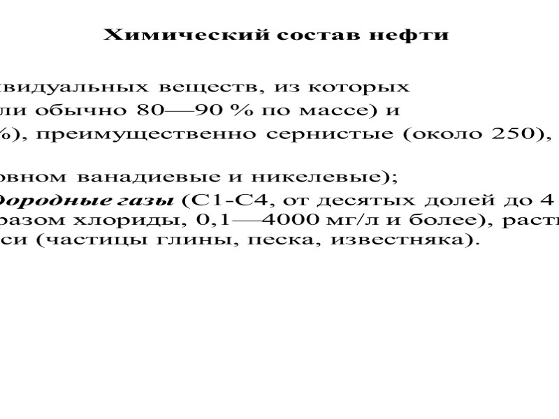 Химический состав нефти Общий состав Нефть представляет собой смесь более 3000 индивидуальных веществ, из которых большая часть — жидкие углеводороды (> 500 или обычно 80—90 % по массе) и гетероатомные органические соединения (4—5 %), преимущественно сернистые (около 250), азотистые (> 30) и кислородные (около 85), а также металлоорганические соединения (в основном ванадиевые и никелевые); остальные компоненты — растворённые углеводородные газы (C1-C4, от десятых долей до 4 %), вода (от следов до 10 %), минеральные соли (главным образом хлориды, 0,1—4000 мг/л и более), растворы солей органических кислот и др., механические примеси (частицы глины, песка, известняка).