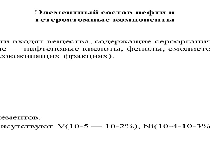 Элементный состав нефти и гетероатомные компоненты Наряду с углеводородами в состав нефти входят вещества, содержащие сероорганические соединения, азотсодержащие, - кислородсодержащие — нафтеновые кислоты, фенолы, смолисто-асфальтеновые и др. вещества (сосредоточены обычно в высококипящих фракциях). Элементный состав (%): С — 82—87, Н — 11—14,5, S — 0,01—6 (редко до 8), N — 0,001—1,8, O — 0,005—0,35 (редко до 1,2) и др. Всего в нефти обнаружено более 50 элементов. Так, наряду с упомянутыми в нефти присутствуют V(10-5 — 10-2%), Ni(10-4-10-3%), Cl (от следов до 2•10-2%) и т. д.