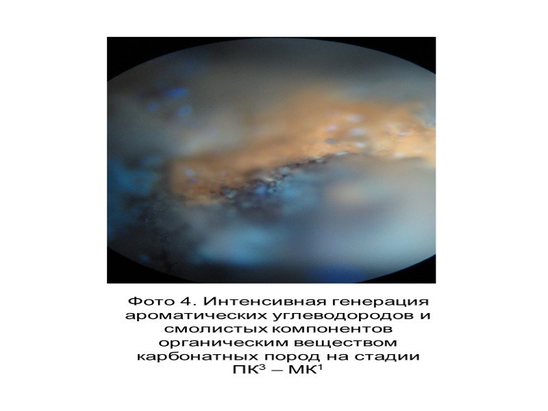 Фото 4. Интенсивная генерация ароматических углеводородов и смолистых компонентов органическим веществом карбонатных пород на стадии ПК3 – МК1