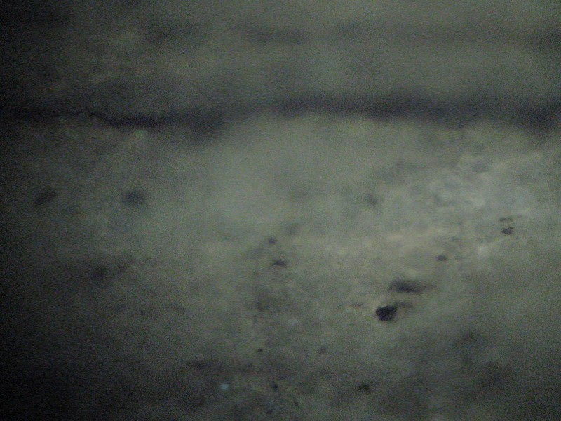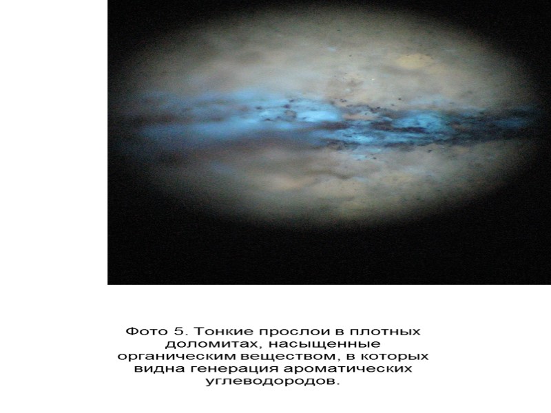 Фото 5. Тонкие прослои в плотных доломитах, насыщенные органическим веществом, в которых видна генерация ароматических углеводородов.
