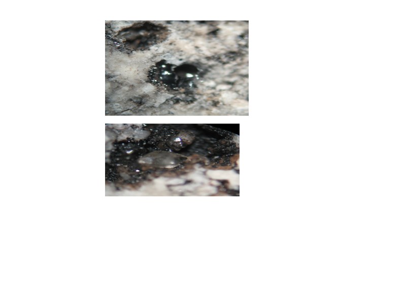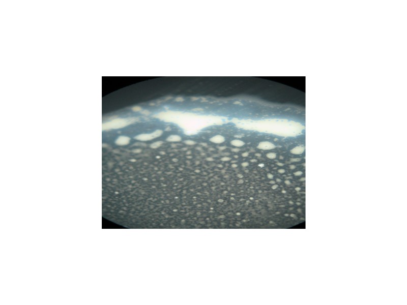 Фото 376. Обр.Е -1006 . Кр. Кутская,14, 4001-4003, C1 t1 up Известняк черный. Под ЛМ: вторичный кристалл кальцита, который при своем росте захватывал из раствора разные по составу растворенные вещества: растворенные органические кислоты (белый цвет) и ароматические УВ (голубой цвет) на конечных стадиях роста кристалла.