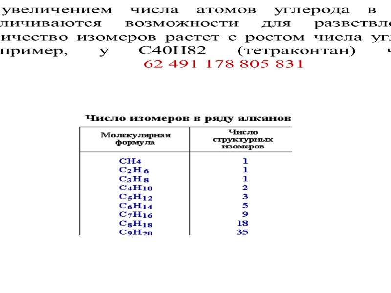 С увеличением числа атомов углерода в составе молекул увеличиваются возможности для разветвления цепи, т.е. количество изомеров растет с ростом числа углеродных атомов. Например, у С40Н82 (тетраконтан) число изомеров 62 491 178 805 831