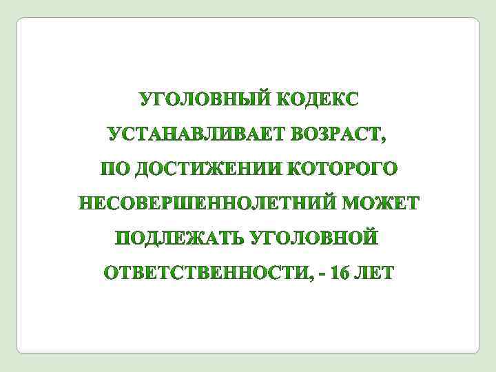 Лица, достигшие ко времени совершения преступления четырнадцатилетнего возраста, подлежат уголовной ответственности за: • убийство; • умышленное причинение тяжкого вреда здоровью, умышленное причинение средней тяжести вреда здоровью; • похищение человека • изнасилование; • насильственные действия сексуального характера;