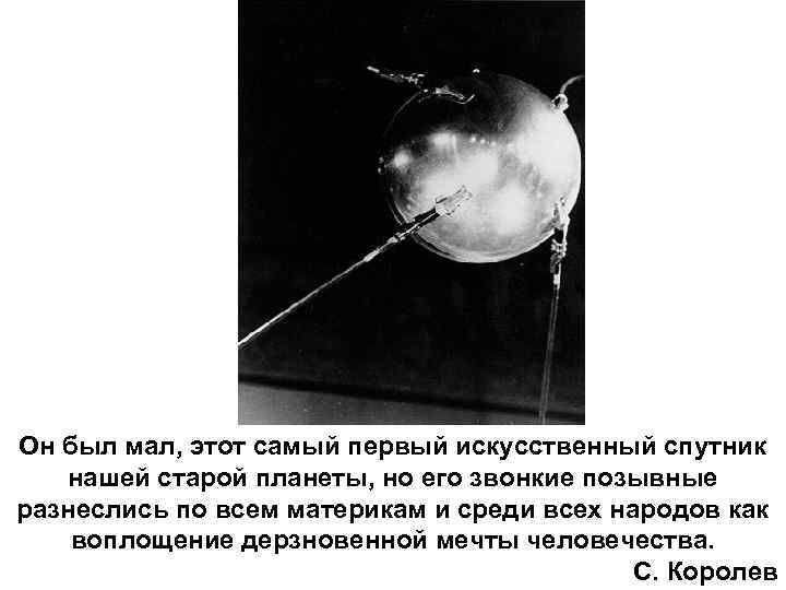 Он был мал, этот самый первый искусственный спутник нашей старой планеты, но его звонкие позывные разнеслись по всем материкам и среди всех народов как воплощение дерзновенной мечты человечества. C. Королев