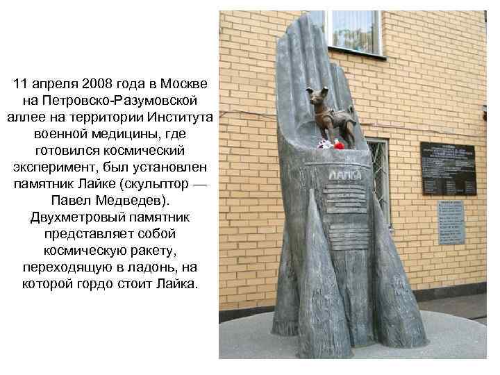 11 апреля 2008 года в Москве на Петровско-Разумовской аллее на территории Института военной медицины, где готовился космический эксперимент, был установлен памятник Лайке (скульптор — Павел Медведев). Двухметровый памятник представляет собой космическую ракету, переходящую в ладонь, на которой гордо стоит Лайка.