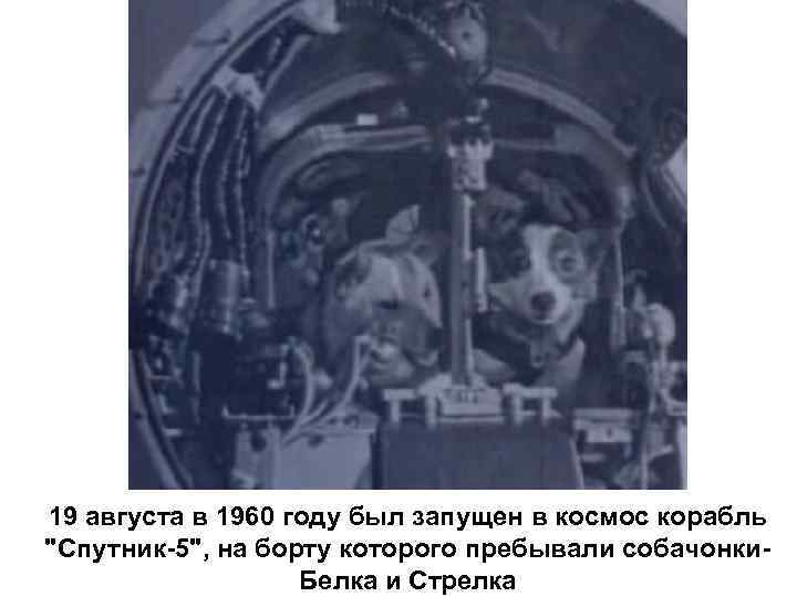 19 августа в 1960 году был запущен в космос корабль "Спутник-5", на борту которого пребывали собачонки. Белка и Стрелка