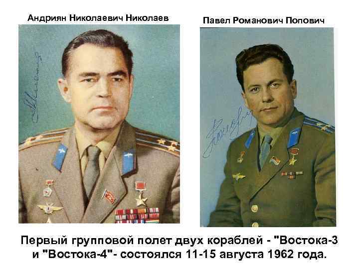 Андриян Николаевич Николаев Павел Романович Попович Первый групповой полет двух кораблей - "Востока-3 и "Востока-4"- состоялся 11 -15 августа 1962 года.