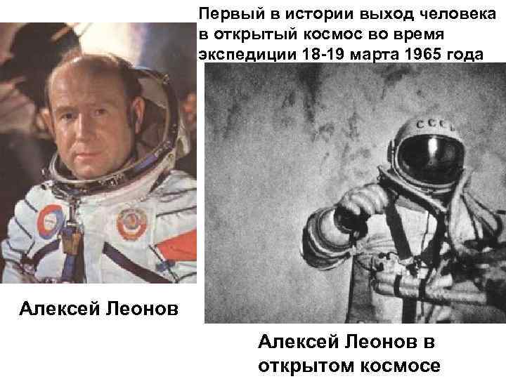 Первый в истории выход человека в открытый космос во время экспедиции 18 -19 марта 1965 года Алексей Леонов в открытом космосе