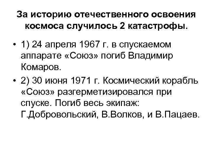 За историю отечественного освоения космоса случилось 2 катастрофы. • 1) 24 апреля 1967 г. в спускаемом аппарате «Союз» погиб Владимир Комаров. • 2) 30 июня 1971 г. Космический корабль «Союз» разгерметизировался при спуске. Погиб весь экипаж: Г. Добровольский, В. Волков, и В. Пацаев.