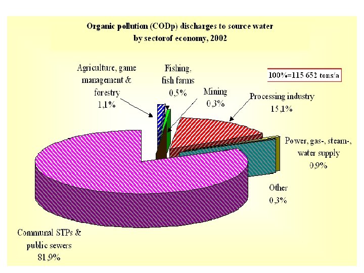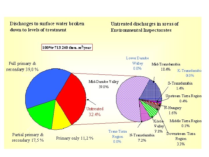 Wastewater collected and pollutant loads in the main river basins Sewage discharged to surface water (million m 3/year) Catchment Primary + partbiological Loads of pollutions (t/a) Primary + full biological CODCr TDS Extract ables Total Untreated Primary only Danube 489, 8 198, 6 57, 1 88, 3 145, 8 89452 270866 7055 35418 6116 Dráva 199, 2 30, 3 22, 4 32, 5 113, 9 24747 175623 2044 12731 1397 Tisza 24, 2 2, 0 0, 08 3, 7 18, 4 1453 26801 130 871 57. 4 Total: 713, 2 231, 0 79, 6 124, 5 278, 1 115652 473290 9229 49020 7570 NH 4 -N TSS