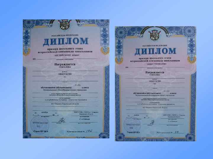 Перечень индивидуальных достижений Участие в предметных олимпиадах Название олимпиады Место, дата проведения Примечания МОУ СОШ с УИОП пгт Опарино 1 ноября 2010 г. Призёр 1 Всероссийская олимпиада школьников по обществознанию МОУ СОШ с УИОП пгт Опарино 19 октября 2010 г. Призёр 2 Всероссийская олимпиада школьников по английскому языку №