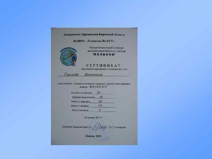 Творческие достижения Участие в конкурсах Название конкурса Место, дата проведения Примечания 1 Международный математический конкурс-игра "Кенгуру" 19 апреля 2010 г. 48 баллов 2 место в школе 2 Международный конкурс "Русский медвежонок - языкознание для всех" ноябрь 2010 г. 49 баллов 3 Международный игровой конкурс "British Bulldog" 10 апреля 2010 г. 84 балла 4 место в школе 4 Международный игровой конкурс "British Bulldog" 12 декабря 2010 г. 66 баллов 5 место в школе 5 Межрегиональный конкурс знатоков иностранных языков "Bridges" 20 января 2011 г. 50 баллов 3 место в школе 6 Районный фотоконкурс "Родной край - Опаринская земля" 26 июня 2010 г. Победитель 31 мая 2010 г. Победитель в номинации "Сочинения, проекты, стихотворения" № 7 Районный конкурс сочинений, рисунков, фоторабот "Портрет вятского учителя глазами детей"