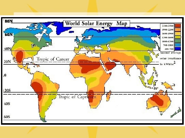 Solar energy vs. demand l l l Total solar = 3850 zettajoules (ZJ) per year. Oceans absorb approximately 285 ZJ of solar energy per year. Winds can theoretically supply 6 ZJ of energy per year. Biomass captures approximately 1. 8 ZJ of solar energy per year. Worldwide energy consumption was 0. 471 ZJ in 2004. [11]