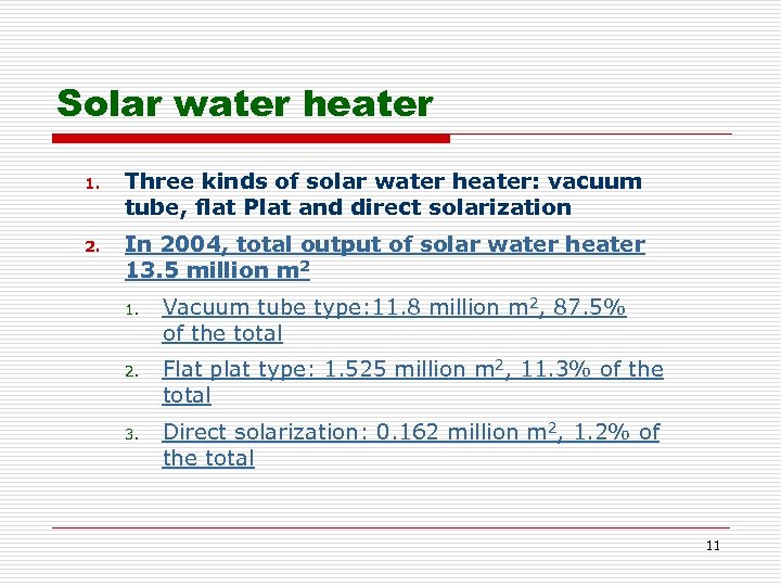 Solar water heater 1. Three kinds of solar water heater: vacuum tube, flat Plat and direct solarization 2. In 2004, total output of solar water heater 13. 5 million m 2 1. Vacuum tube type: 11. 8 million m 2, 87. 5% of the total 2. Flat plat type: 1. 525 million m 2, 11. 3% of the total 3. Direct solarization: 0. 162 million m 2, 1. 2% of the total 11