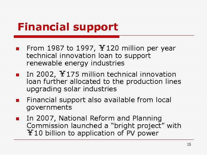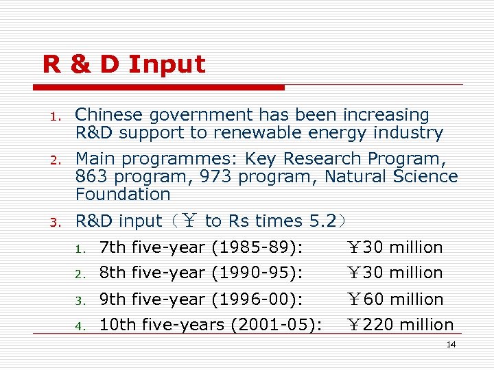 R & D Input 1. Chinese government has been increasing R&D support to renewable energy industry 2. Main programmes: Key Research Program, 863 program, 973 program, Natural Science Foundation 3. R&D input(¥ to Rs times 5. 2) 1. 7 th five-year (1985 -89): ¥ 30 million 2. 8 th five-year (1990 -95): ¥ 30 million 3. 9 th five-year (1996 -00): 4. 10 th five-years (2001 -05): ¥ 60 million ¥ 220 million 14