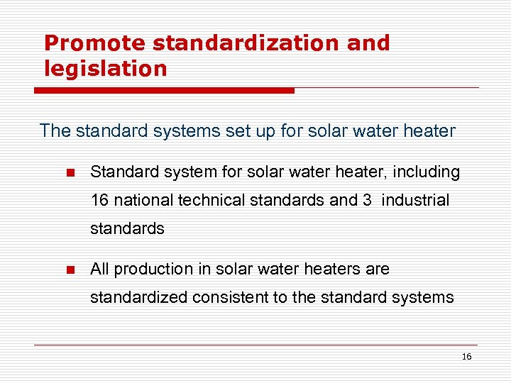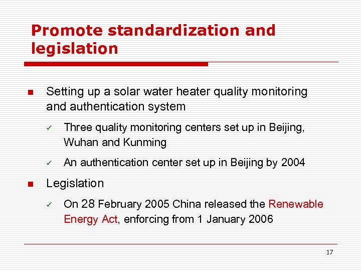 Promote standardization and legislation The standard systems set up for solar water heater n Standard system for solar water heater, including 16 national technical standards and 3 industrial standards n All production in solar water heaters are standardized consistent to the standard systems 16