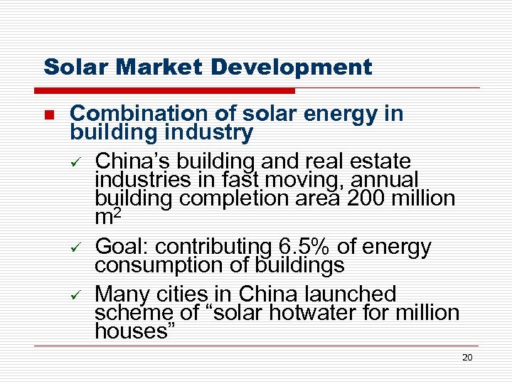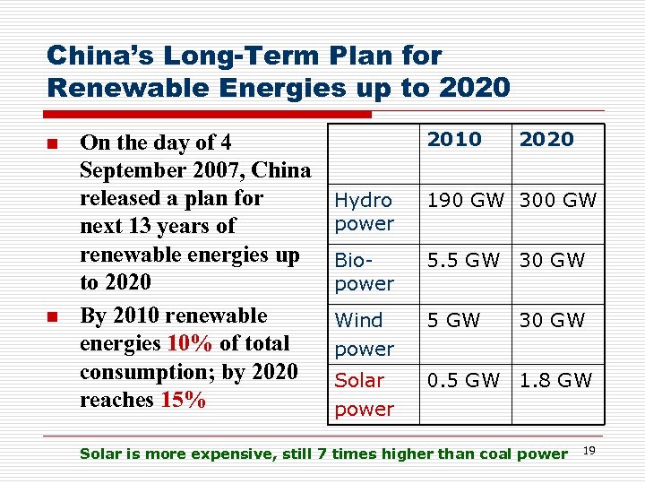China’s Long-Term Plan for Renewable Energies up to 2020 n n On the day of 4 September 2007, China released a plan for next 13 years of renewable energies up to 2020 By 2010 renewable energies 10% of total consumption; by 2020 reaches 15% 2010 2020 Hydro power 190 GW 300 GW Biopower 5. 5 GW 30 GW Wind power 5 GW Solar power 0. 5 GW 1. 8 GW 30 GW Solar is more expensive, still 7 times higher than coal power 19