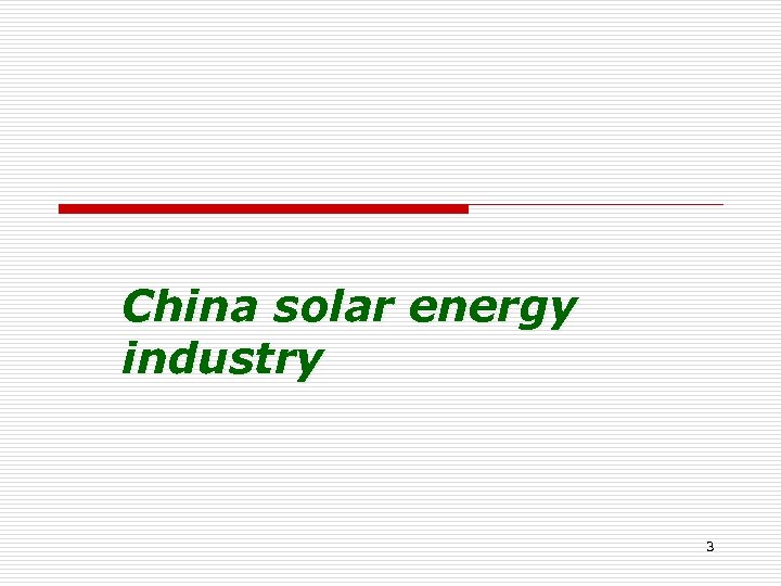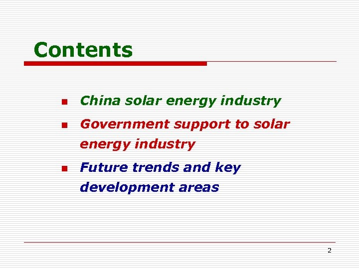 Contents n China solar energy industry n Government support to solar energy industry n Future trends and key development areas 2