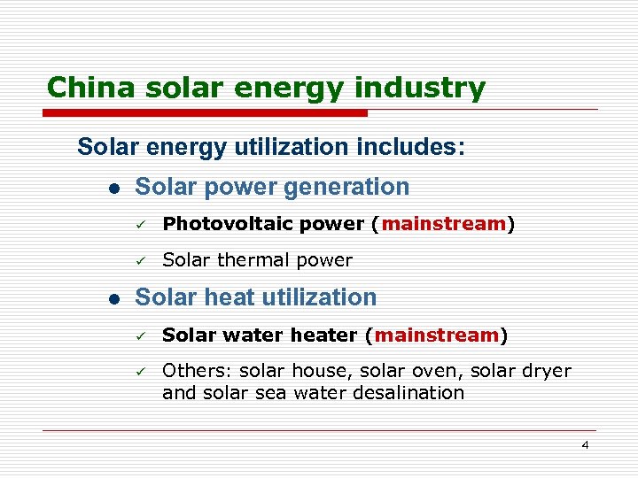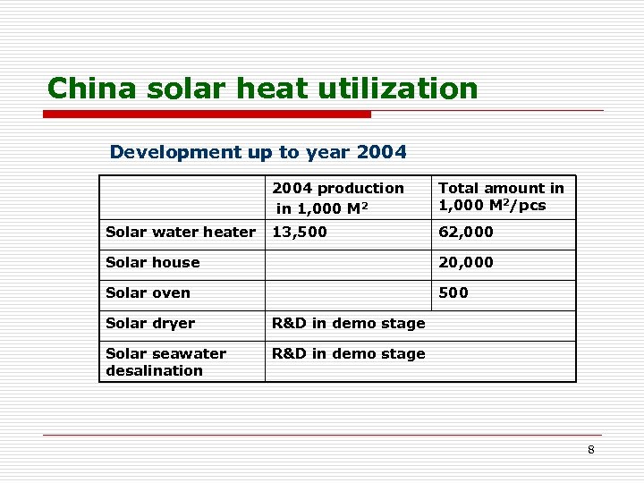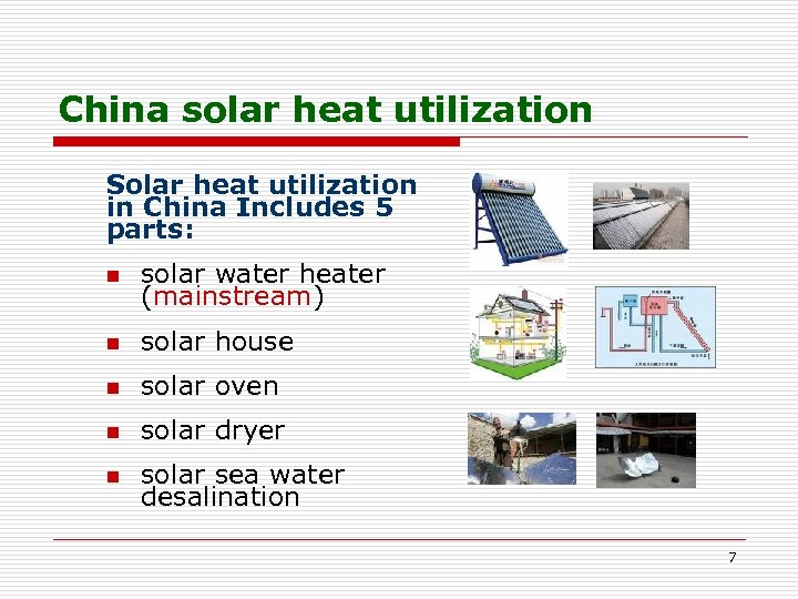 China solar heat utilization Solar heat utilization in China Includes 5 parts: n solar water heater (mainstream) n solar house n solar oven n solar dryer n solar sea water desalination 7