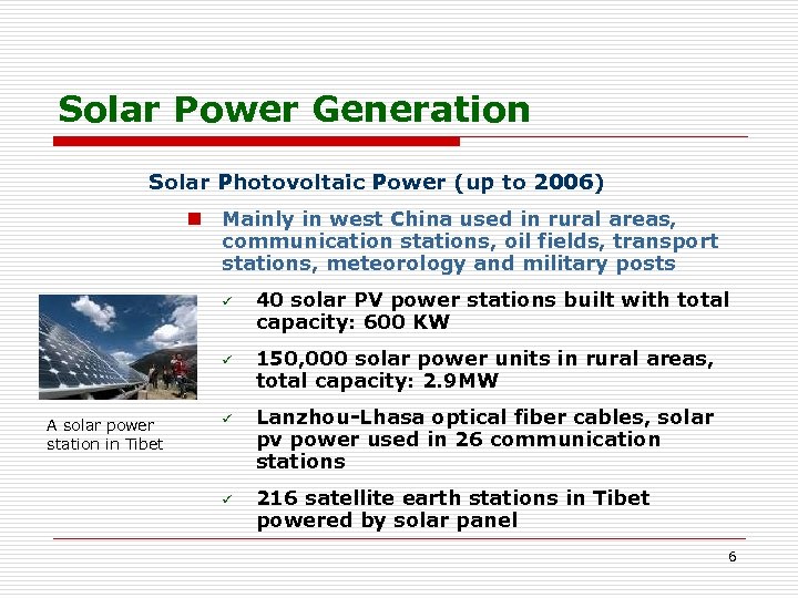 Solar Power Generation Solar Photovoltaic Power n 1984: annual output 200 KM n 1988: annual output 4. 5 MW n 2005: annual output 139 MW n 2006: annual output 300 MW n China: ranking the 3 rd in the world n Solar energy efficiency of monocrystalline silicon cell : 11 -13% (commercial), 25% (in lab) 5