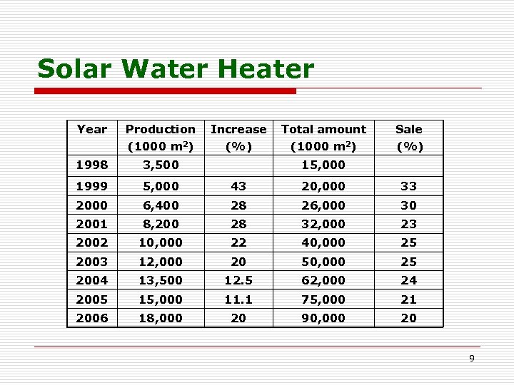 Solar Water Heater Year Production (1000 m 2) Increase (%) Total amount (1000 m 2) Sale (%) 1998 3, 500 1999 5, 000 43 20, 000 33 2000 6, 400 28 26, 000 30 2001 8, 200 28 32, 000 23 2002 10, 000 22 40, 000 25 2003 12, 000 20 50, 000 25 2004 13, 500 12. 5 62, 000 24 2005 15, 000 11. 1 75, 000 21 2006 18, 000 20 90, 000 20 15, 000 9