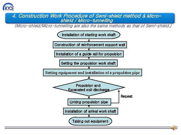 4. Construction Work Procedure of Semi-shield method & Micro- 조직도 shield / Micro-tunnelling (Micro-shield/Micro-tunnelling are also the same methods as that of Semi-shield. ) Installation of starting work shaft Construction of reinforcement support wall Installation of a guide rail for propulsion Setting the propulsion work shaft Setting equipment and installation of a propulsion pipe Propulsion and Excavated soil discharge Repeat Linking propulsion pipe Installation of arrival work shaft Taking out equipment