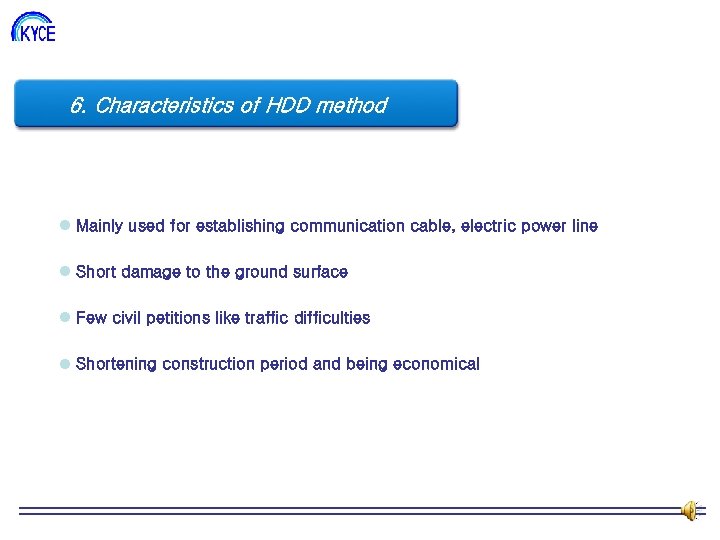 6. Characteristics 도 HDD method 조 직 of l Mainly used for establishing communication cable, electric power line l Short damage to the ground surface l Few civil petitions like traffic difficulties l Shortening construction period and being economical