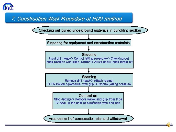 7. Construction Work Procedure of HDD method 조직도 Checking out buried underground materials in punching section Preparing for equipment and construction materials Shooting Input drill head-> Control jetting pressure-> Checking out head position with deep locator-> Arrive at drill head target pit Reaming Remove drill head-> Attach reamer -> Fix Swivel pipe/cable with grip-> Control jetting pressure Completion Stop Jetting-> Remove swivel and grip from Pipe -> Seal up the shift of pipe/cable with end cap Arrangement of construction site and withdrawal