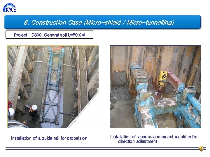 8. Construction Case (Micro-shield / Micro-tunnelling) Project D 300. General soil L=50. 0 M Installation of a guide rail for propulsion Installation of laser measurement machine for direction adjustment