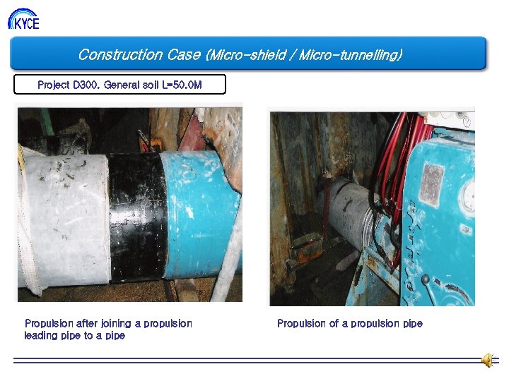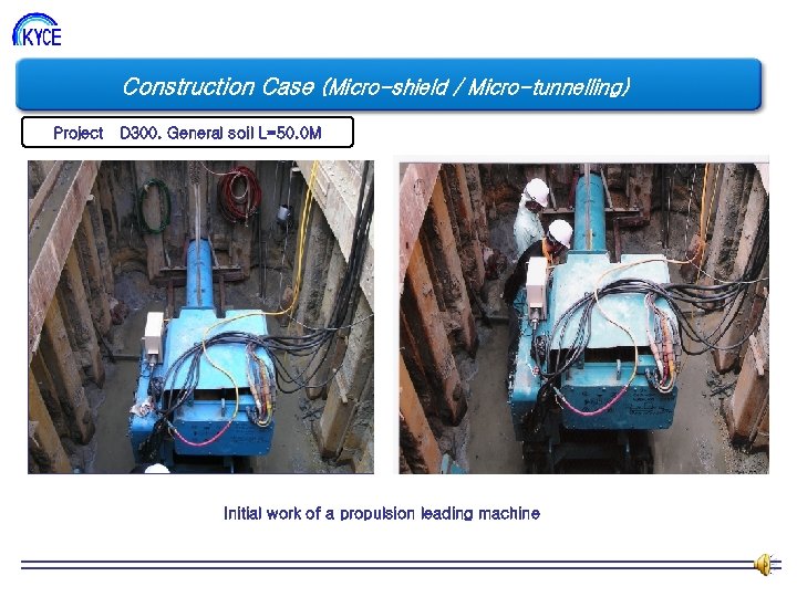 Construction Case (Micro-shield / Micro-tunnelling) Project D 300. General soil L=50. 0 M Propulsion after joining a propulsion leading pipe to a pipe Propulsion of a propulsion pipe