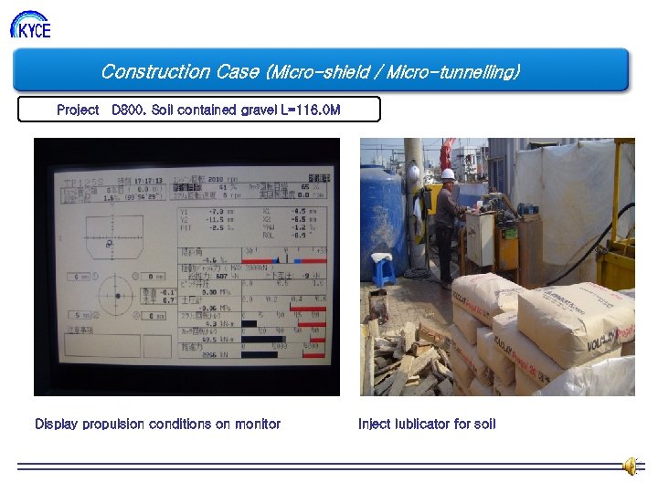 Construction Case (Micro-shield / Micro-tunnelling) Project D 800. Soil contained gravel L=116. 0 M Display propulsion conditions on monitor Inject lublicator for soil