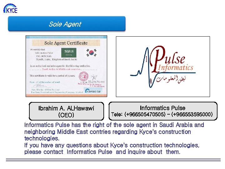 Sole Agent Ibrahim A. ALHawawi (CEO) Informatics Pulse Tele: (+966505470505) – (+966553595000) Informatics Pulse has the right of the sole agent in Saudi Arabia and neighboring Middle East contries regarding Kyce's construction technologies. If you have any questions about Kyce's construction technologies, please contact Informatics Pulse and inquire about them.