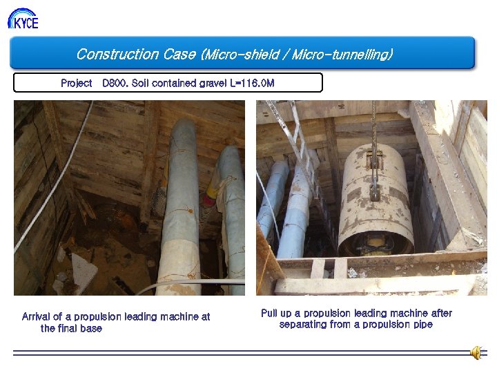 Construction Case (Micro-shield / Micro-tunnelling) Project D 800. Soil contained gravel L=116. 0 M Arrival of a propulsion leading machine at the final base Pull up a propulsion leading machine after separating from a propulsion pipe