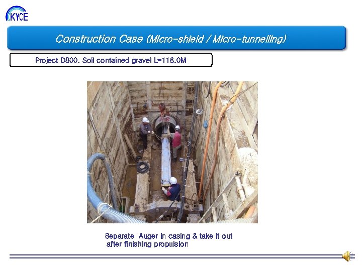 Construction Case (Micro-shield / Micro-tunnelling) Project D 800. Soil contained gravel L=116. 0 M Separate Auger in casing & take it out after finishing propulsion