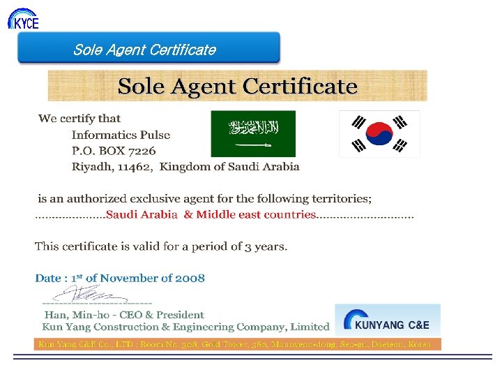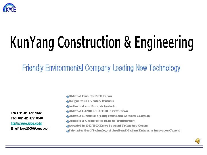Obtained Inno-Biz Certification Designated as a Venture Business Authorized as a Research Institute Tel: +82 -42 -472 -0546 Fax: +82 -42 -472 -0549 http: ///www. kyce. co. kr Email: kyce 2000@paran. com Obtained ISO 9001 / ISO 14001 Certification Obtained Certificate Quality Innovation Excellent Company Obtained A Certificate of Business Transparency Awarded in 2002/2003 Korea Patented Technology Contest Selected as Good Technology of Small and Medium Enterprise Innovation Contest