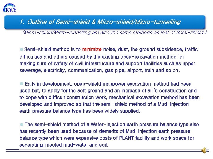 1. Outline of Semi-shield & Micro-shield/Micro-tunnelling 조직도 (Micro-shield/Micro-tunnelling are also the same methods as that of Semi-shield. ) l Semi-shield method is to minimize noise, dust, the ground subsidence, traffic difficulties and others caused by the existing open-excavation method for making sure of safety of civil infrastructure and support facilities such as upper sewerage, electricity, communication, gas pipe, airport, train and so on. l Early in development, open-shield manpower excavation method had been used but, to apply for the soft ground an increase of sill’s construction and to cope with difficult construction work, mechanical excavation method has been developed and improved so that the semi-shield method of a Mud-injection earth pressure balance type has been widely supplied. l The semi-shield method of a Water-injection earth pressure balance type also has recently been used because of demerits of Mud-injection earth pressure balance type which were expensive costs of PLANT facility and work space for separating injected mud-water and soil.