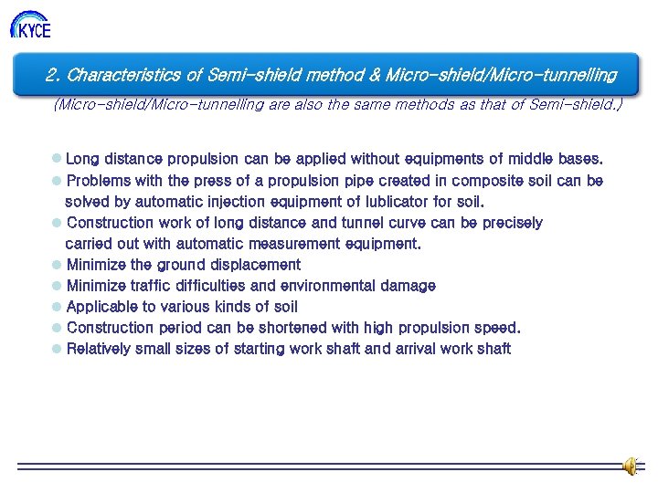 2. Characteristics of Semi-shield method & Micro-shield/Micro-tunnelling (Micro-shield/Micro-tunnelling are also the same methods as that of Semi-shield. ) l Long distance propulsion can be applied without equipments of middle bases. l Problems with the press of a propulsion pipe created in composite soil can be solved by automatic injection equipment of lublicator for soil. l Construction work of long distance and tunnel curve can be precisely carried out with automatic measurement equipment. l Minimize the ground displacement l Minimize traffic difficulties and environmental damage l Applicable to various kinds of soil l Construction period can be shortened with high propulsion speed. l Relatively small sizes of starting work shaft and arrival work shaft