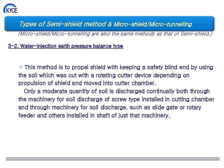 Types of Semi-shield method & Micro-shield/Micro-tunnelling 조직도 (Micro-shield/Micro-tunnelling are also the same methods as that of Semi-shield. ) 3 -2. Water-injection earth pressure balance type l This method is to propel shield with keeping a safety blind end by using the soil which was cut with a rotating cutter device depending on propulsion of shield and moved into cutter chamber. Only a moderate quantity of soil is discharged continually both through the machinery for soil discharge of screw type installed in cutting chamber and through machinery for soil discharge, such as slide gate or rotary feeder and others installed in shaft of just that machinery.